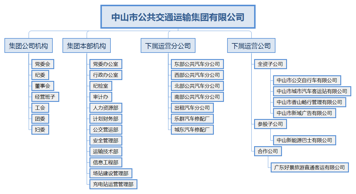 (二)集团公司本部设立机构:党委办公室、行政办公室、纪检室、审计办、人力资源部、计划财务部、公交营运部、安全管理部、运输技术部、信息工程部、场站建设管理部、充电站运营管理部。