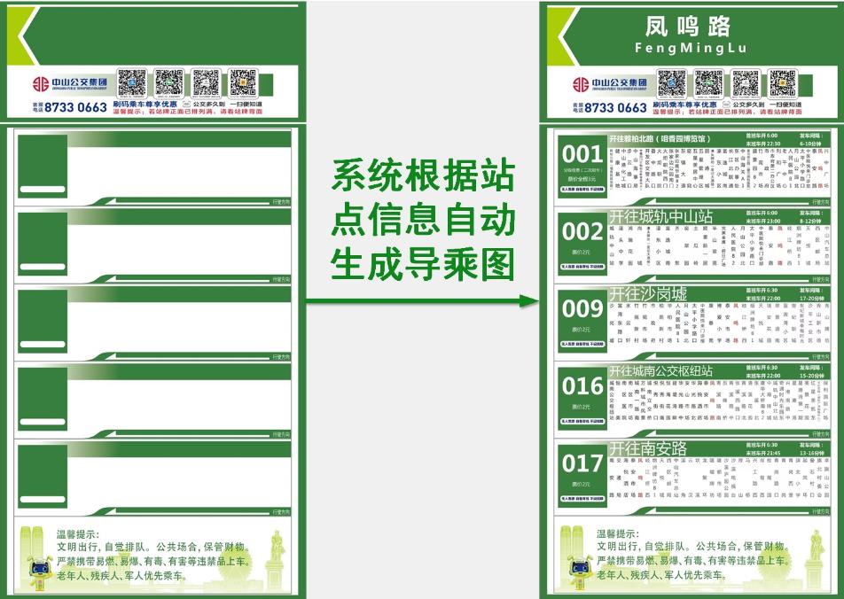 长期以来,传统公交站牌导乘图的制作依赖于人工单张编辑的方式,存在效率低下、样式不统一、易出错、耗费人力等痛点。为破解这一难题,中山公交集团信息技术团队直面挑战,自主研发“公交站牌版面管理系统”,通过先进的信息化技术手段,实现了对公交站牌导乘图的自动化生成与集中化管理。