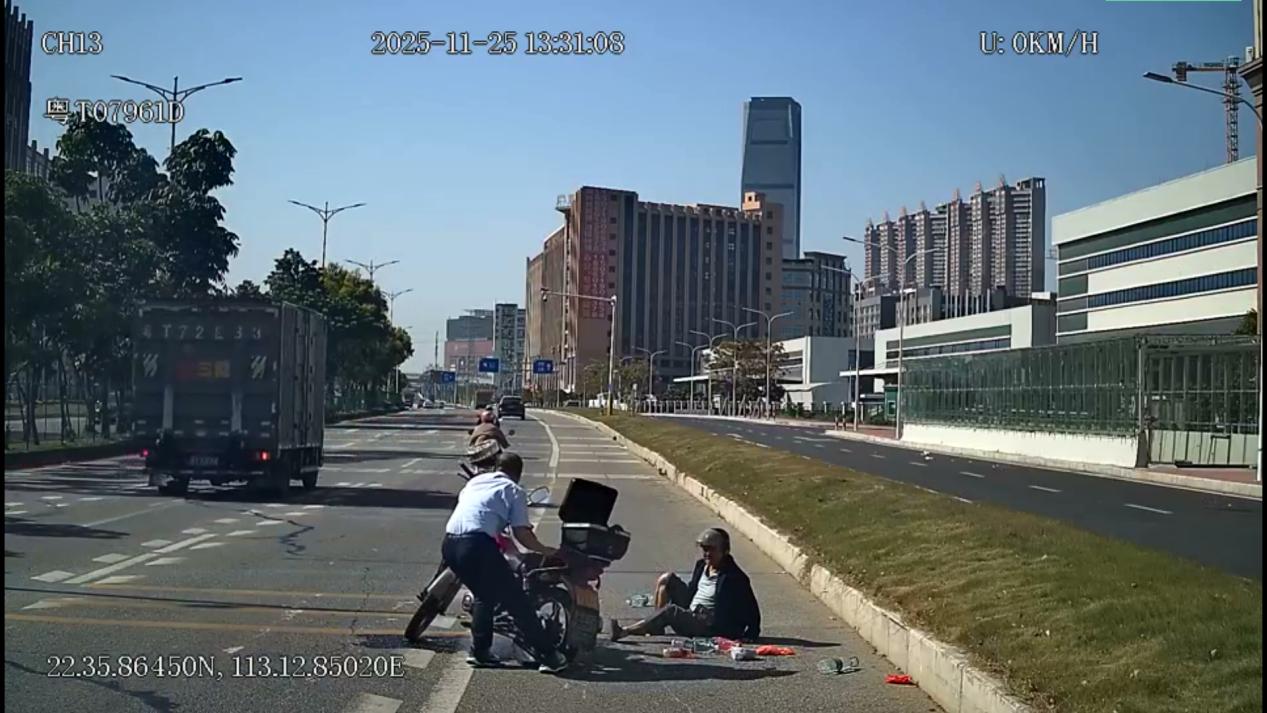 同日早上6时35分,三乡车队驾驶员陈庆峰在执行603线路营运任务途经三乡交警大队红绿灯路口时,遇见一位老人骑车摔倒在机动车道。陈师傅迅速停车开启警示灯,并与乘客合力将老人扶至路边花基休息,仔细地询问伤情。得知老人无需送医后,他又将老人的车辆推到安全区域,确认老人无大碍后才继续投入营运。