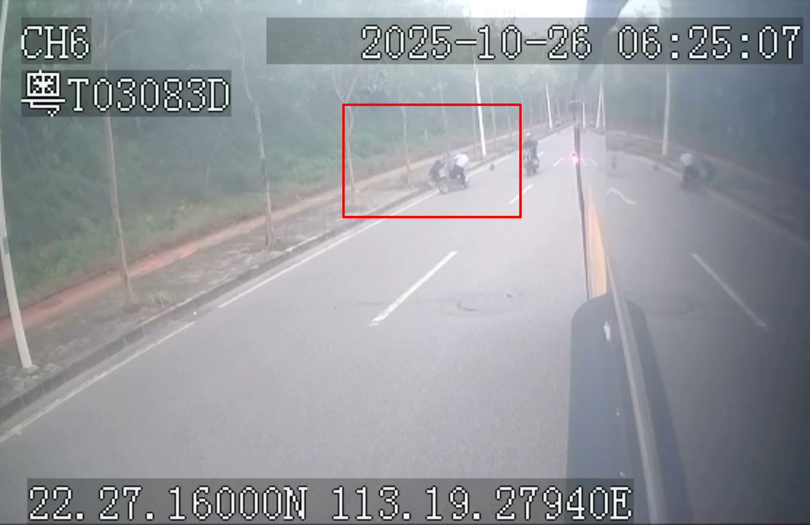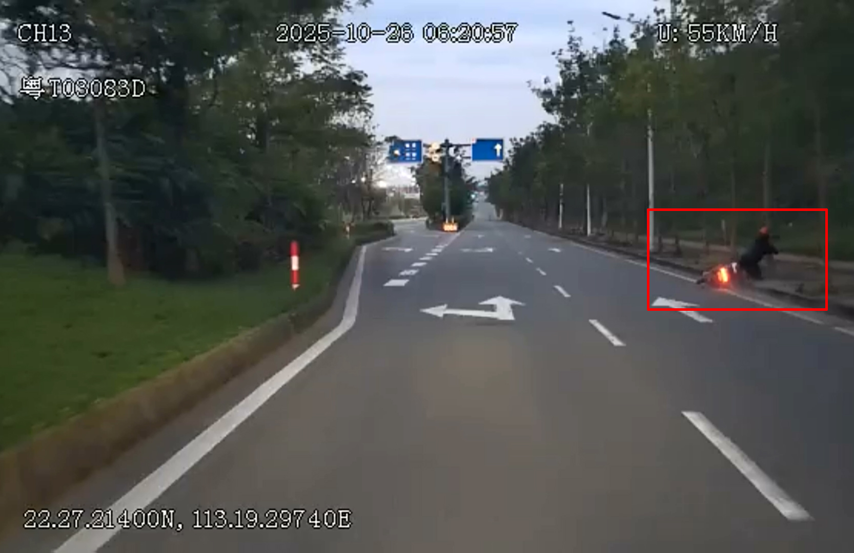 图为驾驶员李佐先发现男子骑车撞上路旁不慎翻倒