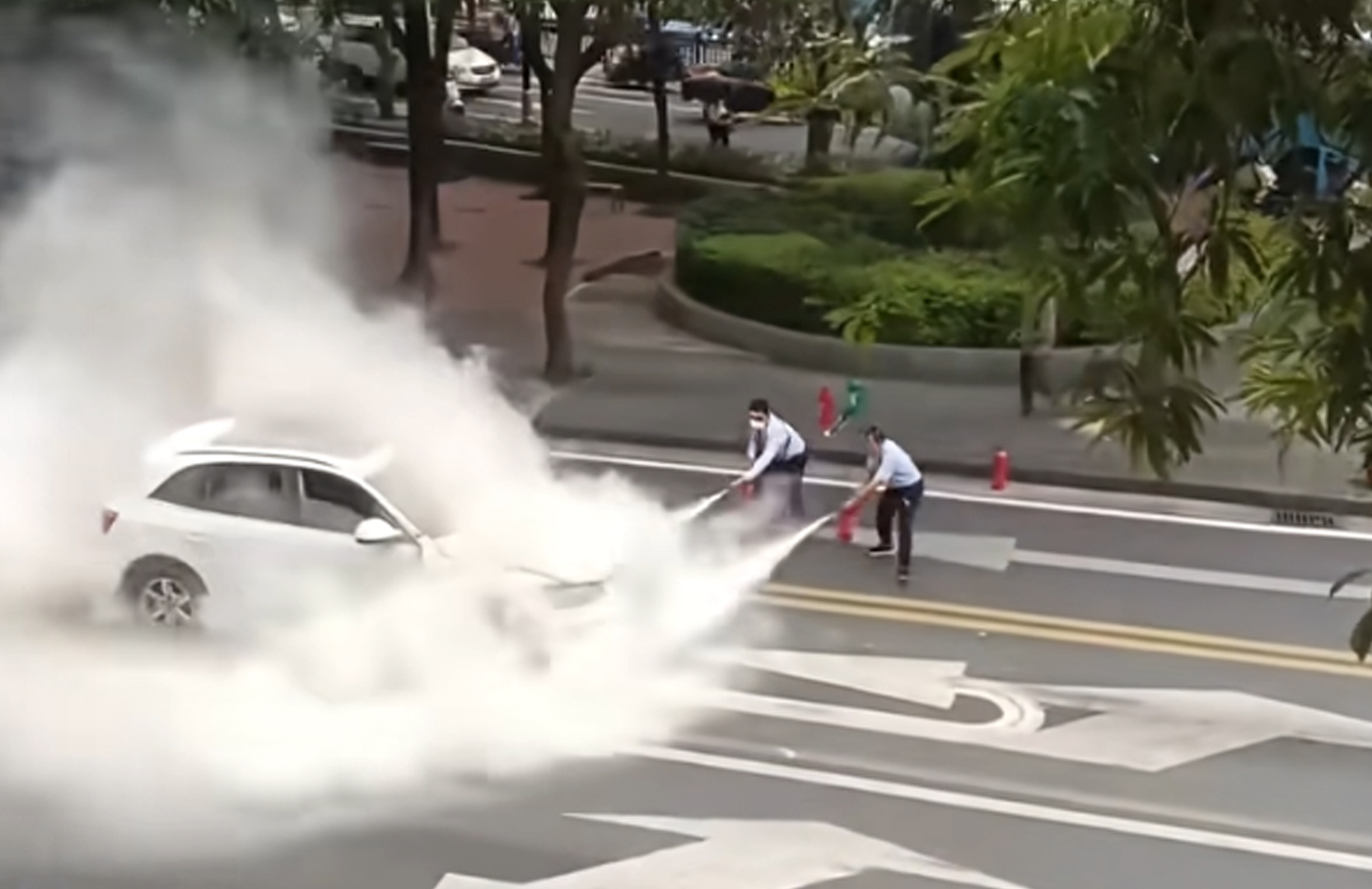图为驾驶员卢孙文和邓瑞强拿着灭火器对起火的私家车进行灭火