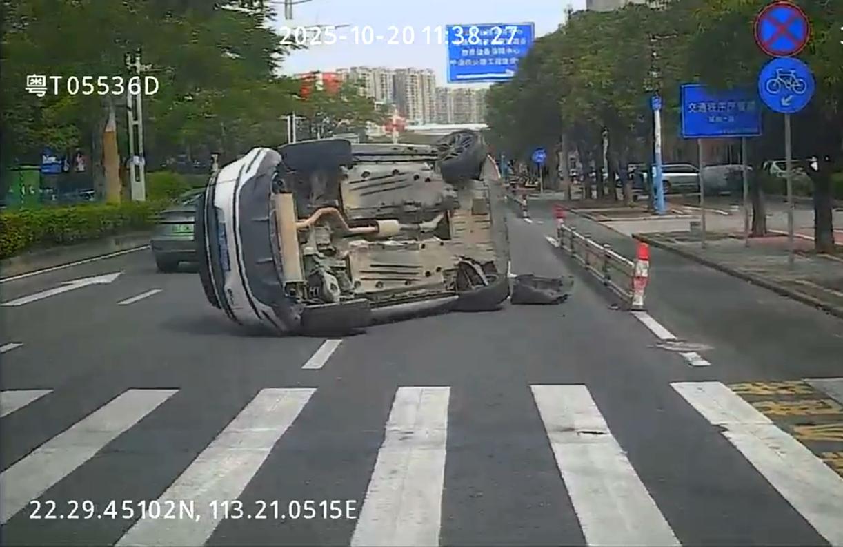 图为驾驶员杨兴胜发现私家车撞上路边的护栏发生侧翻