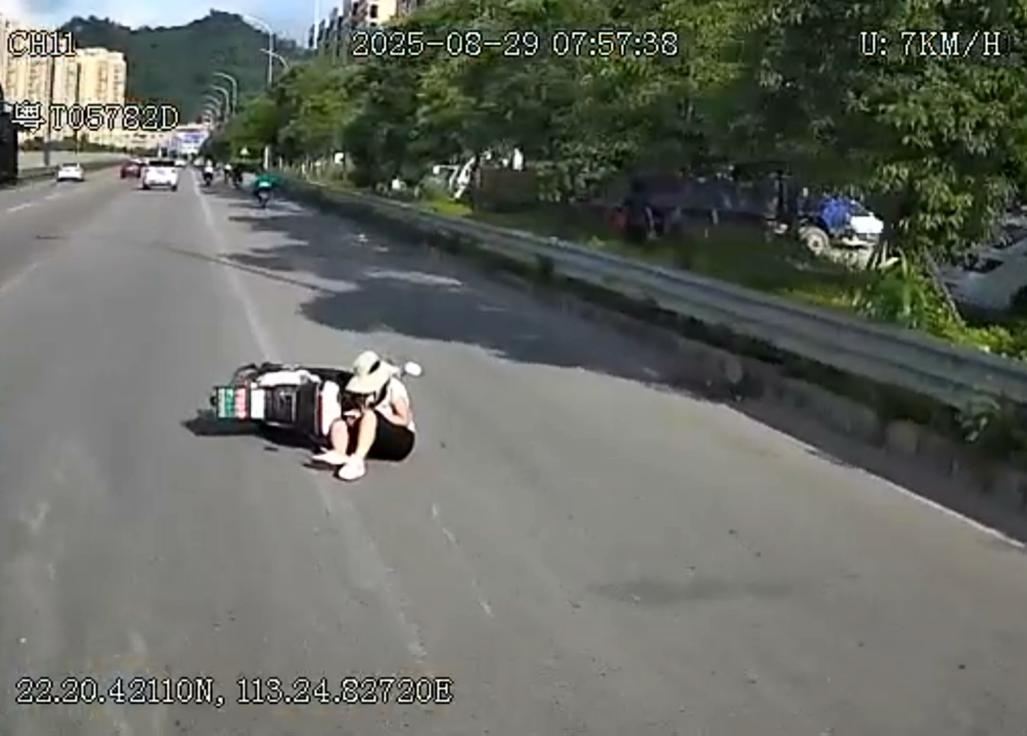 图为驾驶员廖永和发现女子骑车不慎摔倒无法起身