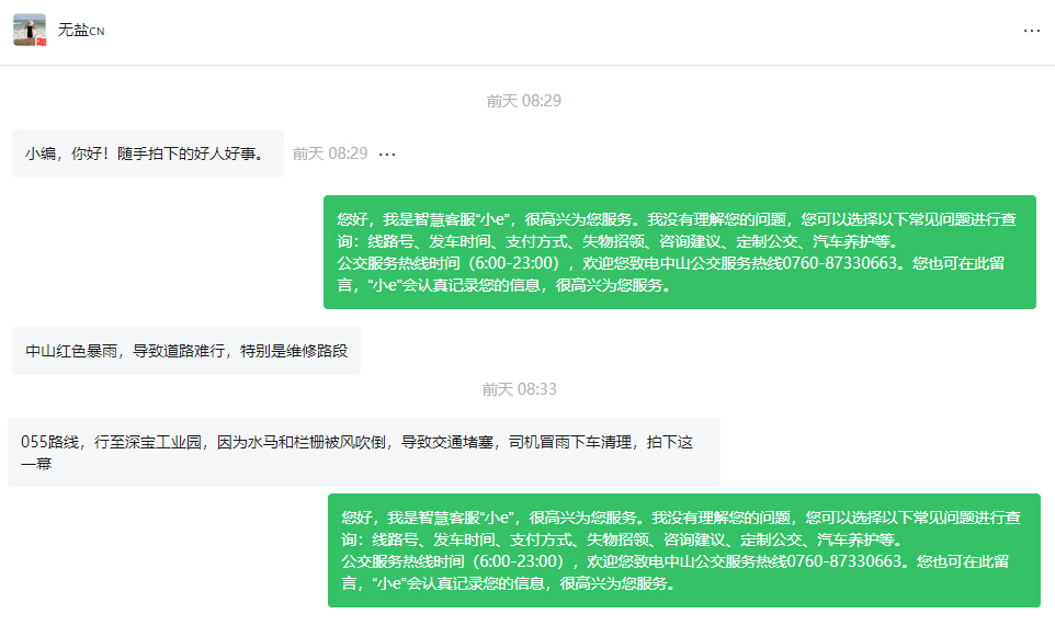 从覃宏付雨中清障到雷阳华救助摩托车主,从农大庆帮扶摔伤女车主到黄明俭助力扶车,从夜半“叫应人”到冒雨“探路者”,中山公交人用实际行动证明“礼遇公交”不仅是服务标准,更是融入血脉的职业信仰。智慧客服“小e”则架起市民与公交的连心桥,让这些暖心故事被看见、被传递。未来,中山公交将继续以“礼遇公交”为引领,在智慧服务的助力下,让每一次出行都成为传递城市温度的窗口,让“路堵心不堵”的承诺化作市民出行的永恒保障,共同书写更有温度的城市交通篇章。