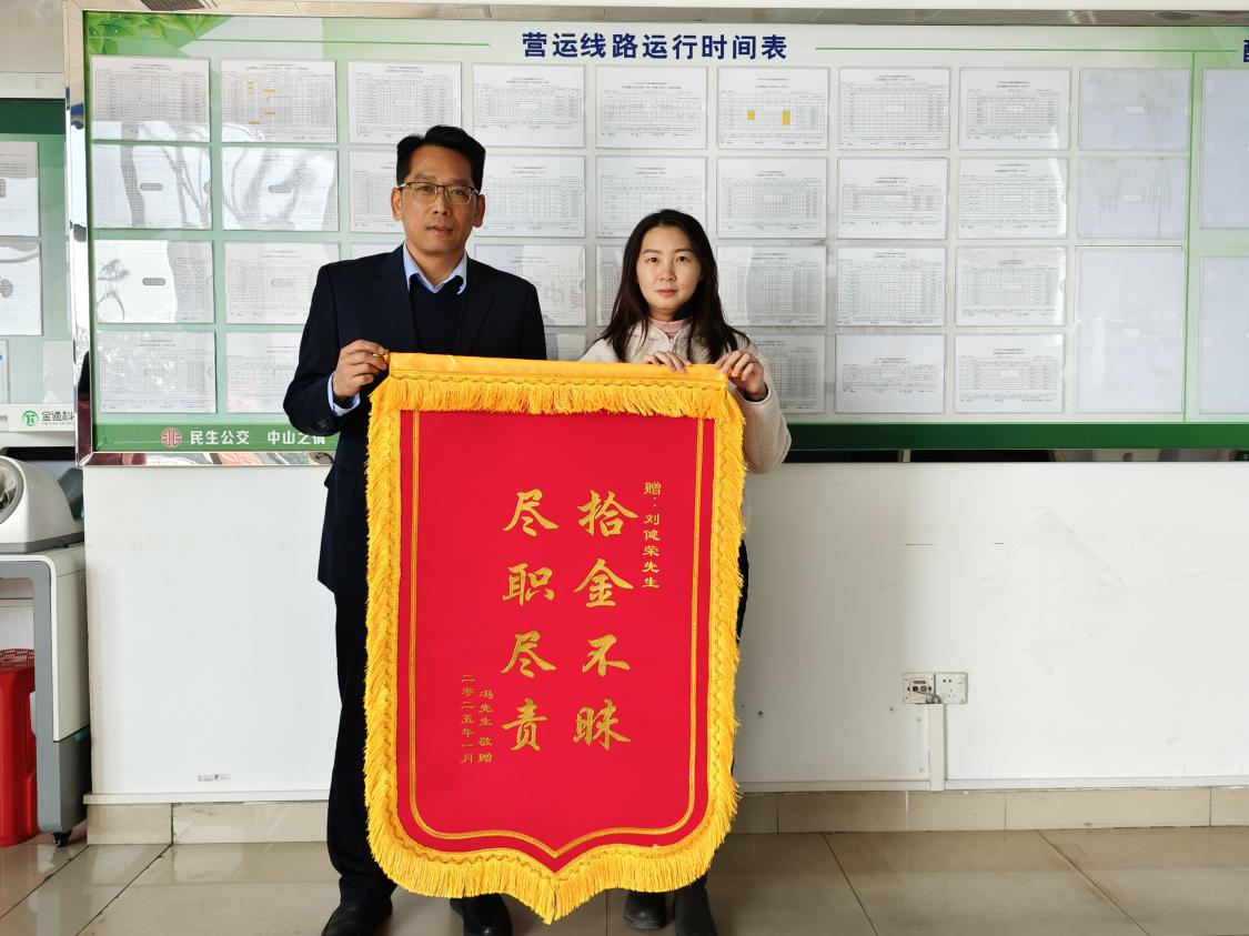 1月1日,城南车队驾驶员刘健荣驾驶粤t05538d号公交车执行 b23 路营运任务,到达终点站城轨中山站后,照常检查车厢卫生。在检查过程中,他发现了一个遗留在座位上的钱包,内有现金以及身份证。刘师傅将钱包妥善保管,马上联系车队,登记寻找失主的相关信息。后在公交集团客服中心的帮助下联系到了失主冯先生,并在1月3日到城南车队调度室领回失物。1月7日,冯先生委托家人再次来到城南车队,将一面绣有“拾金不昧,尽职尽责”的锦旗送给车队工作人员,让其转赠给驾驶员刘师傅,并再次对刘师傅拾金不昧的行为以及工作人员表达感激之情。