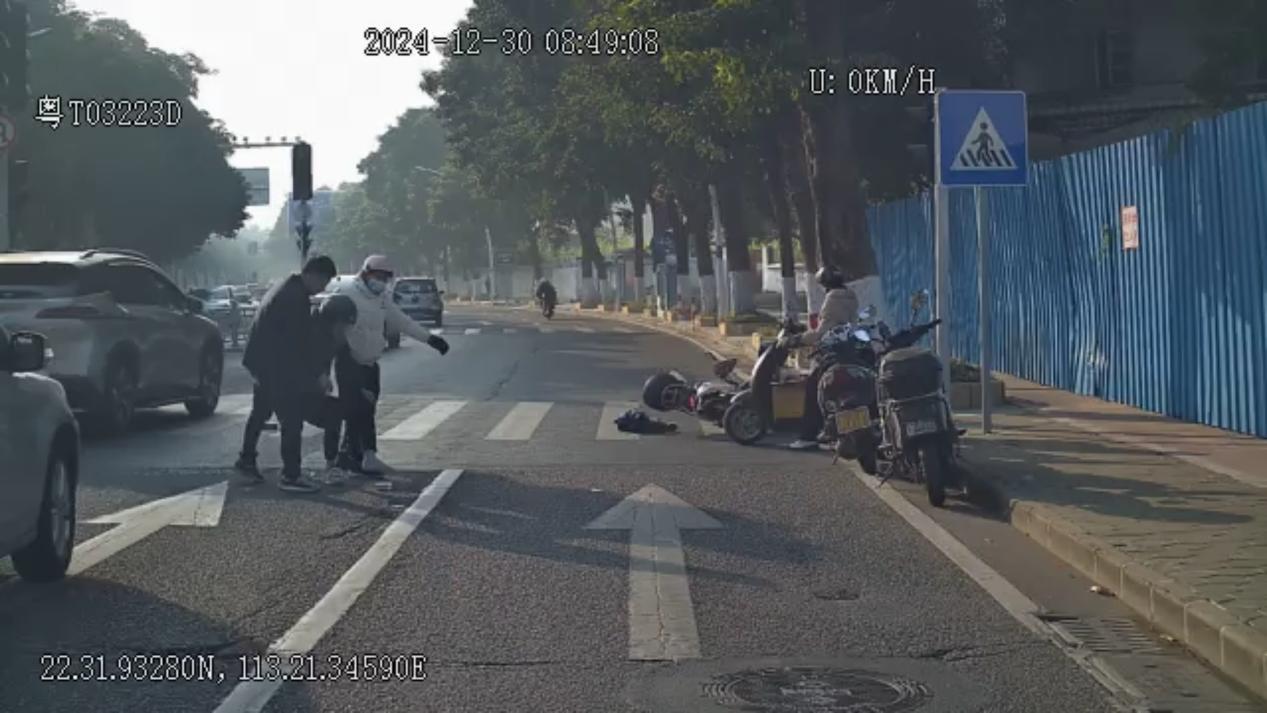 2024年12月30日,古镇车队驾驶员欧阳国协驾驶粤t03223d号公交车执行202路线营运任务,由市中医院开往海洲健身广场方向。8时47分,车辆途经狮滘口桥公交站时,欧阳师傅发现前方斑马线上一辆摩托车与电动自行车发生刮碰,两名车主均倒在马路上,摩托车车主被压着无法动弹。由于当时处于早高峰时段,车流较多,容易对车主造成二次伤害,欧阳师傅立即将车辆安全停靠后下车帮忙。欧阳师傅先是询问摩托车车主受伤情况,接着和路过的一位热心市民一起扶起摩托车,然后再将摩托车车主搀扶到路边安全区域。欧阳师傅询问车主等人情况,在确认他们身体有无大碍后才放心返回车上,继续投入营运。