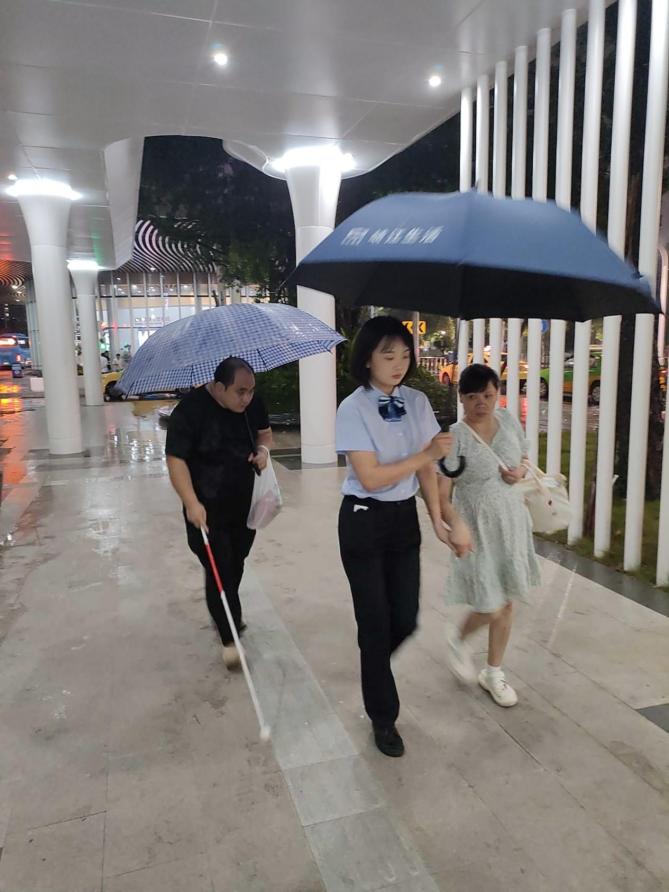 由于两名视障乘客中途还要换乘公交车才能到达目的地,想到大雨带来的种种不便,于是刘芳建议他们搭乘网约车前往目的地。两名乘客同意并表示感谢,刘芳随后帮忙约了网约车。待两名视障乘客安全上车后,刘芳再三叮嘱司机务必将乘客安全送达后,才快速跑回自己的岗位。约40分钟后,网约车驾驶员致电刘芳,得知两名乘客已安全到达,刘芳才放下心来。