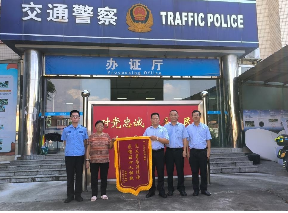 近日,市民熊女士来到中山市公安局交通警察支队古镇大队,将一面印有“见义勇为传佳话 感谢好心人相救”的锦旗赠送给中山公交集团驾驶员谢鑫,对其助人为乐的善举表示感谢。