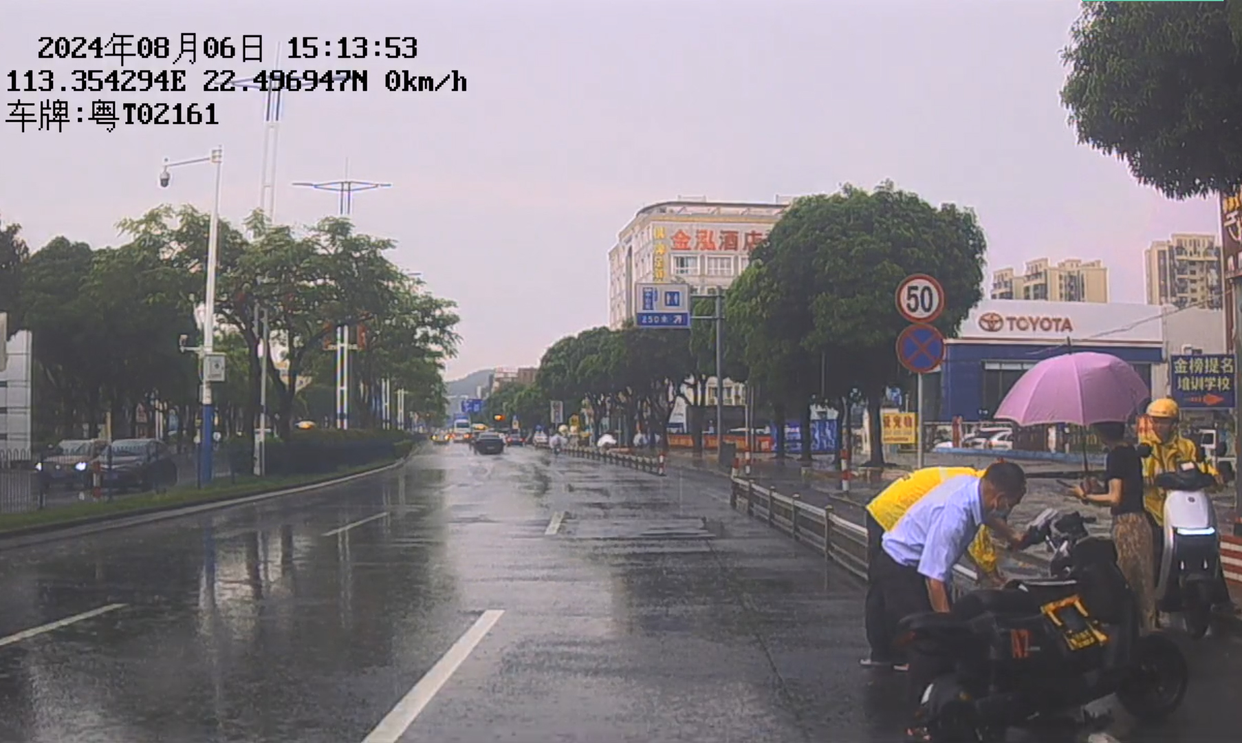 图为驾驶员陈凤中帮骑手扶起电动车