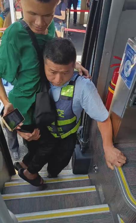 7月8日,在中山国际人才港出现暖心一幕:中山公交集团值勤安全员袁征新及时伸出援手,帮助一名残疾乘客乘坐公交车,获得车上乘客一致点赞。