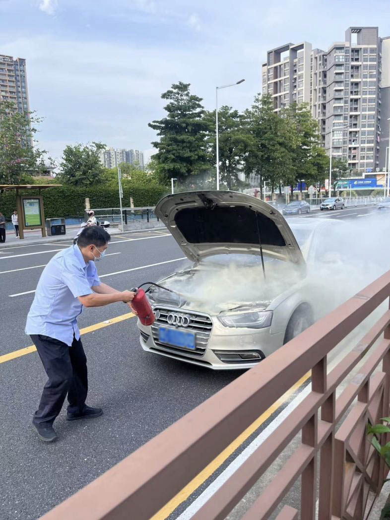 无独有偶,5月17日11时15分,三乡车队驾驶员蒋创荣在执行998路营运任务,途经文昌路东站路口时,一位市民突然跑过来向他求助。原来该市民的小车突发自燃,情急之下便向恰巧经过的蒋师傅求助。情况紧急,蒋师傅立即将车辆安全靠边停好,迅速将驾驶位的灭火器从侧窗递给车主,然后自己提起一支灭火器快速跑向起火车辆进行扑救。与此同时,同车队的公交驾驶员李大忠也刚好行驶到了事发地点,随即一起参与到扑救中去。在两位驾驶员共同协助下,成功扑灭车辆火情。