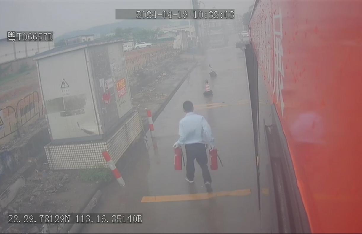 同样挺身救火的还有乐群车队驾驶员廖镜东。4月19日上午,廖镜东驾驶粤t06657d号公交车执行079线路营运任务,由叠石出发开往沙溪中学。10时30分,车辆途经大涌镇溪叠路路段时,廖镜东发现前方一辆停靠在路边的白色货车车头位置冒起白烟,车主十分着急。情急之下立即将车辆安全停靠在路边,拉好手刹打开双闪,与车上乘客简单说明情况后,拿起车上的2支手提灭火器迅速跑到白色货车前,接着拿起灭火器喷管熟练地对准货车冒烟位置进行猛喷,最终使用了2支灭火器才将火苗扑灭。随后廖镜东再三检查货车,确认私家车无复燃迹象后,才返回公交车上继续投入到营运中。