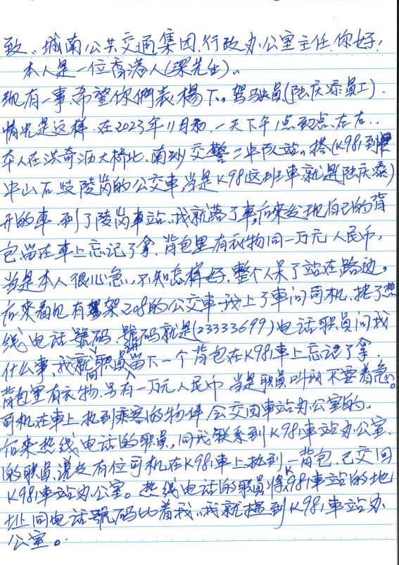 近日,一封来自香港的表扬信送到中山公交集团。乘客梁先生在信中表示,感谢中山公交k981路驾驶员陆庆添拾金不昧的行为,同时点赞中山公交集团优质的公交服务。
