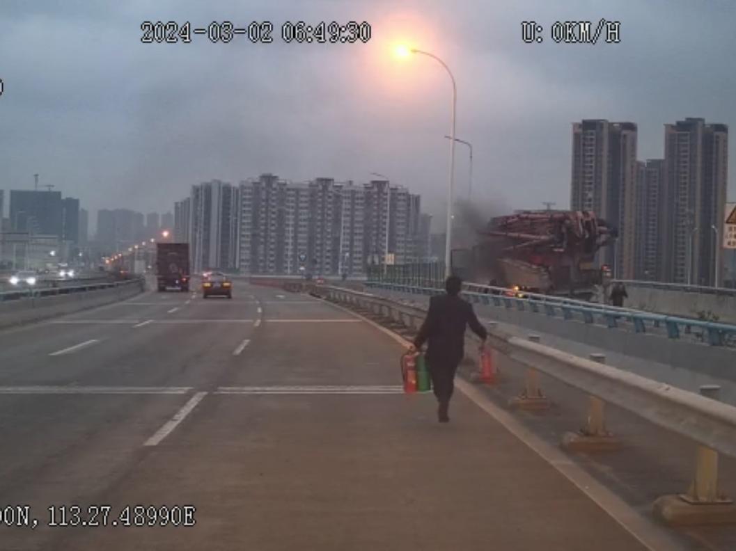 3月2日,民众车队驾驶员莫永健驾驶粤t04582d号公交车执行包车任务。6时48分,当车辆行驶至中山港大桥时,莫师傅远远地看到前方一辆大型混凝土泵车停在引桥,车的中间位置冒起了浓烟,左后轮还有火苗窜出。车主及随车人员正在路面向过往的车辆寻求帮助。事态紧急,莫师傅立即将车辆停靠在安全区域,提着3瓶灭火器下车帮忙灭火。他将两瓶灭火器分给工程车的车主及随车人员,并指挥其中一人立即拨打119报警。三人同时对着起火根部喷射。但因火势过大,当三瓶灭火器用完后,仍未将火势扑灭,过往的车辆也并未携带能够灭火的器具。为了安全起见,莫师傅只好和车主等人放弃扑救并疏散现场,等候消防人员。莫师傅在疏散现场设置好警示标识后,便提着三瓶用完的灭火器返回车内,离开现场继续执行包车任务。