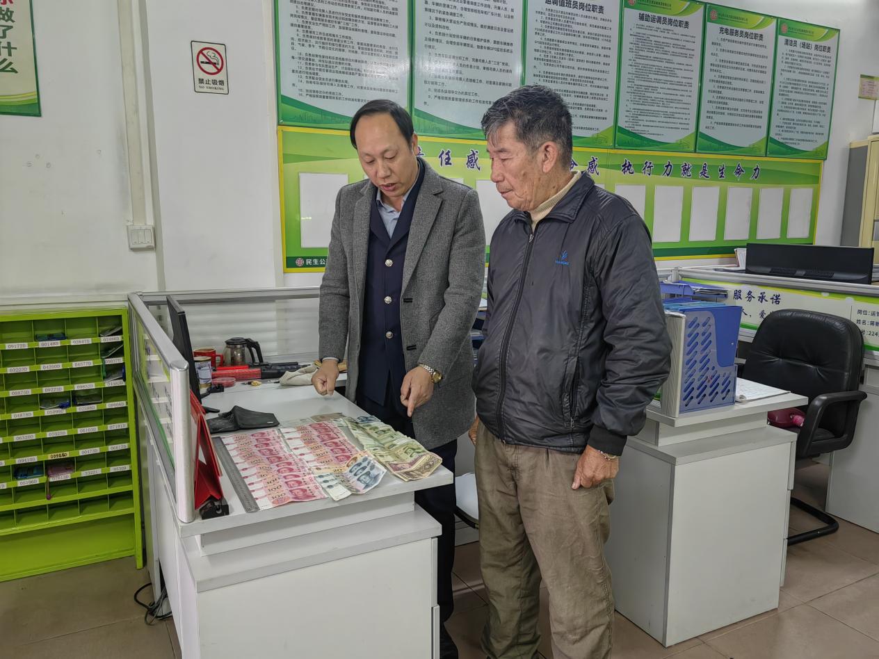 翌日,杨伯来到民众车队办公室,核实相关信息取回失物。杨伯表示,遗失的现金虽然不多,但却是他一个月的生活费,很感谢公交驾驶员拾金不昧的精神。随后杨伯想酬谢帮助他找回失物的陈师傅以及车队工作人员,被车队工作人员婉言谢绝。车队工作人员表示这些都是公交集团员工应该做的,是我们公交人职业道德的一部分。