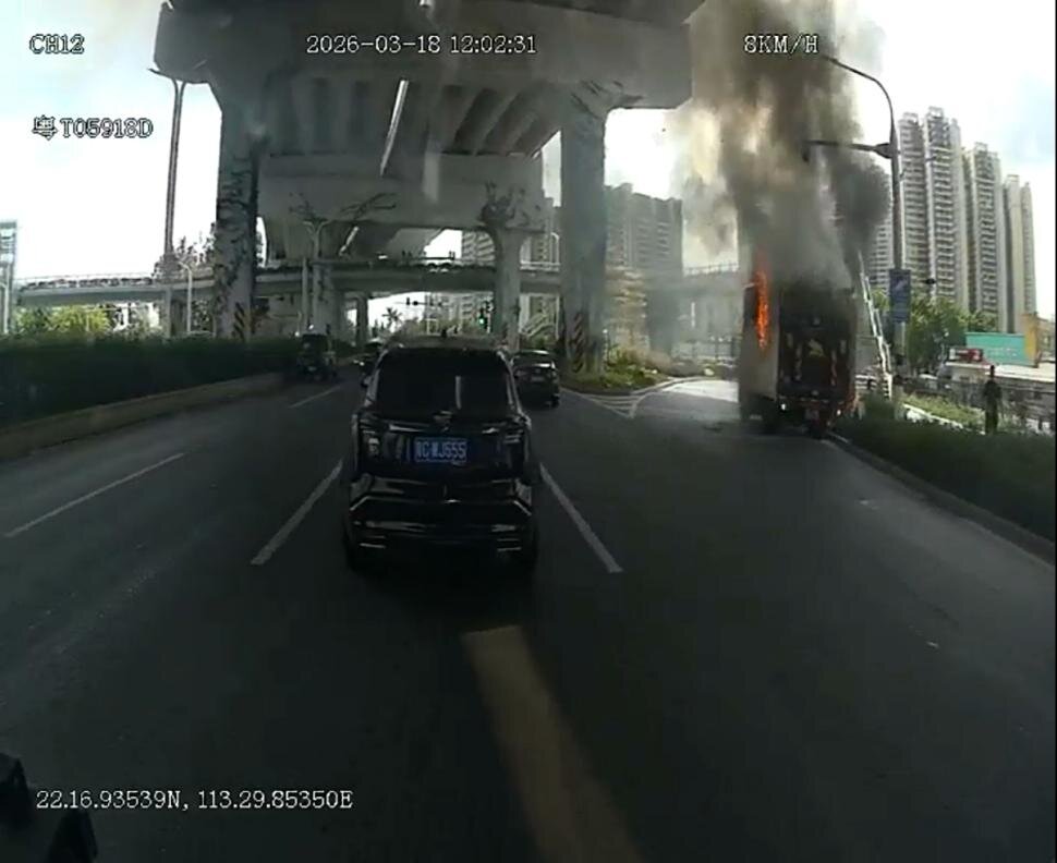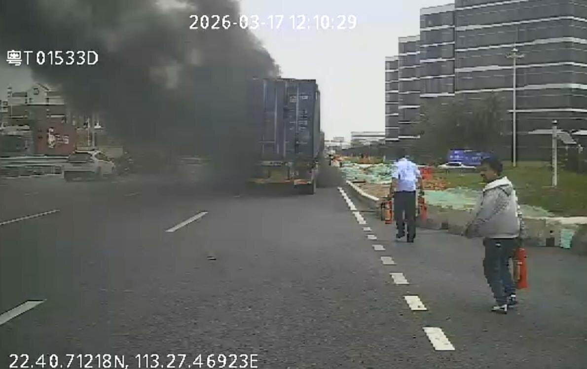 3月18日12时02分,珠海市南溪站旁的十字路口突发险情,一辆货车突然起火,现场浓烟滚滚,火势迅速蔓延。危急关头,正在执行营运任务的乐群车队K995路线驾驶员李福贵发现火情后,立即停稳车辆,简单向乘客说明情况后,便和车内一位乘客一起拎起车载灭火器冲向起火货车。