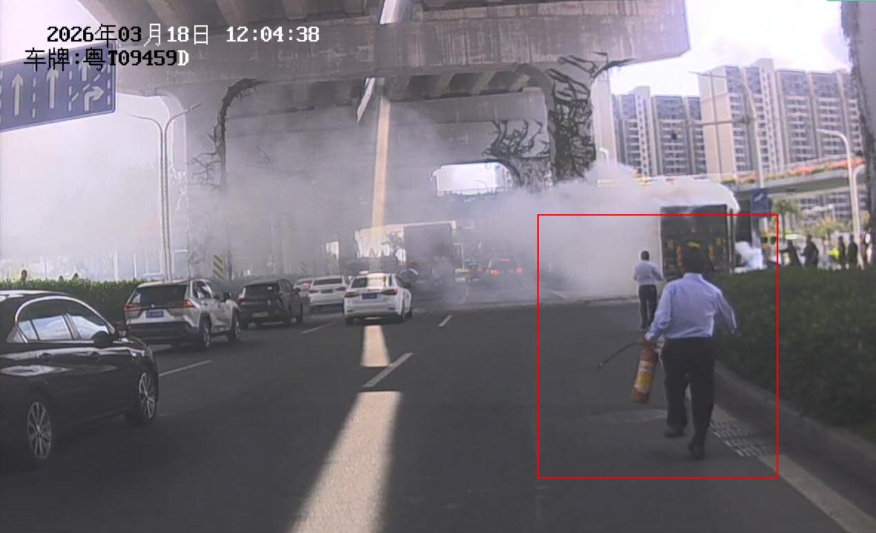 随后,两人提着灭火器对准起火点精准喷射再用完两支灭火器后,火势被有效压制。待消防车抵达现场,杨师傅和热心乘客返回车上,然后继续投入营运。
