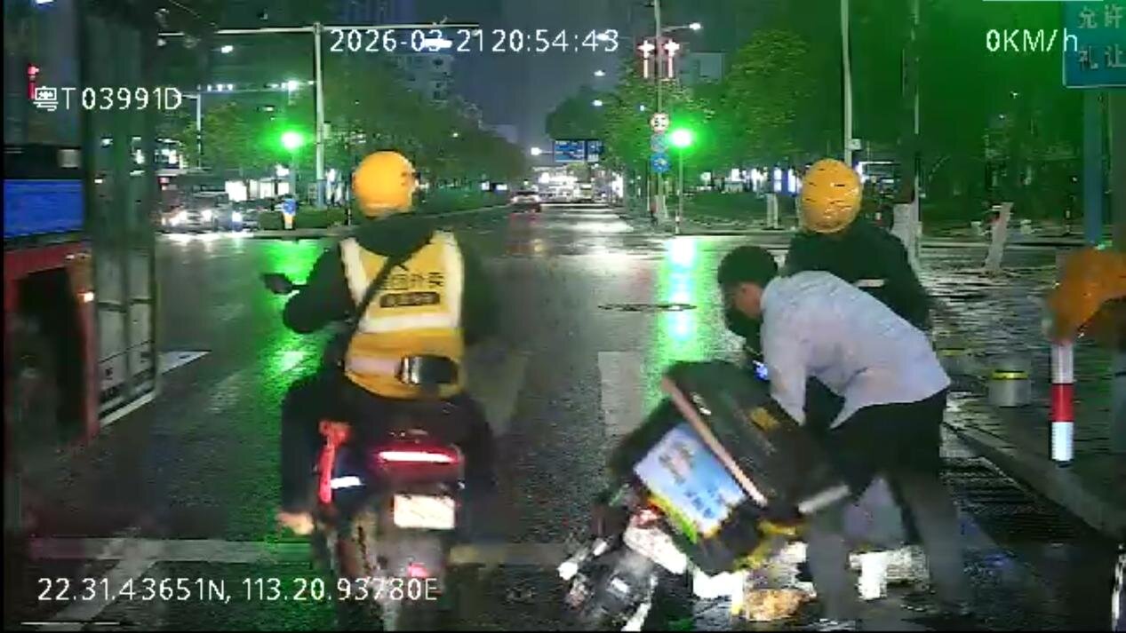 图为公交驾驶员黄桂生协助骑手扶起电动车