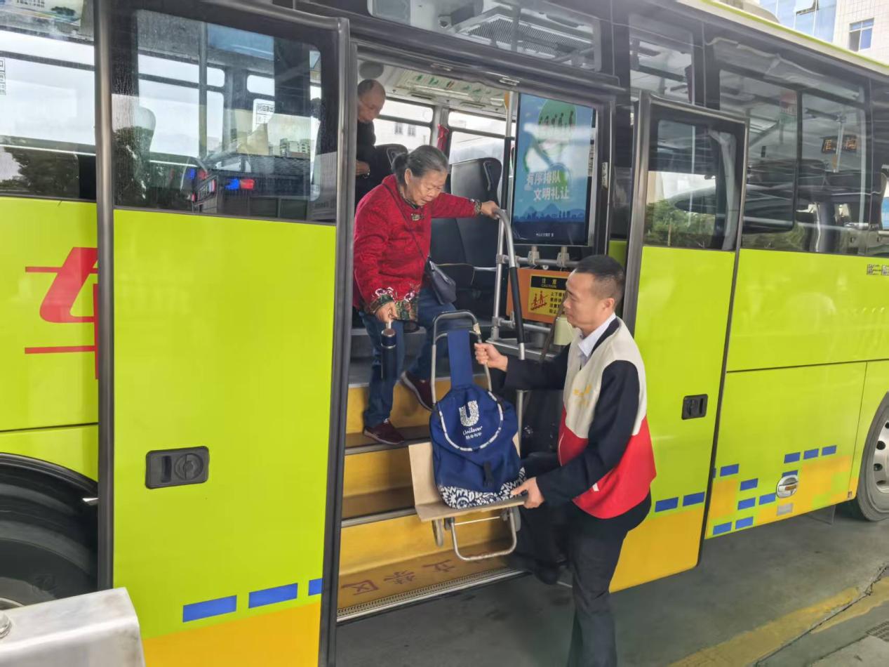 图为公交志愿者协助市民下车