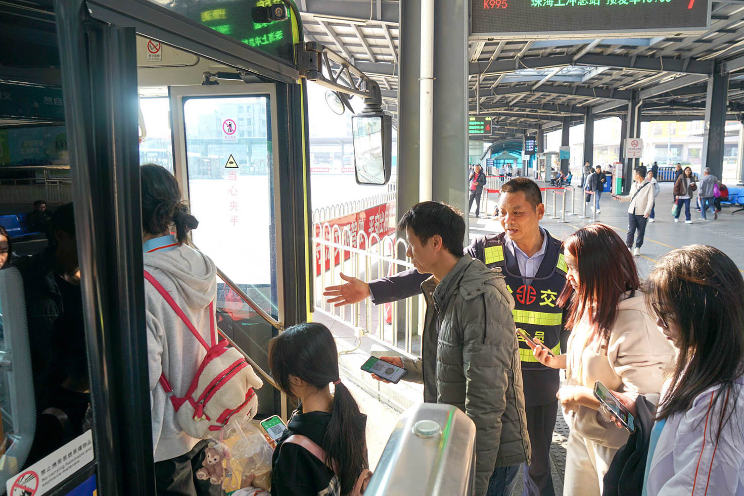 图为安全员芦炳垣引导市民乘车