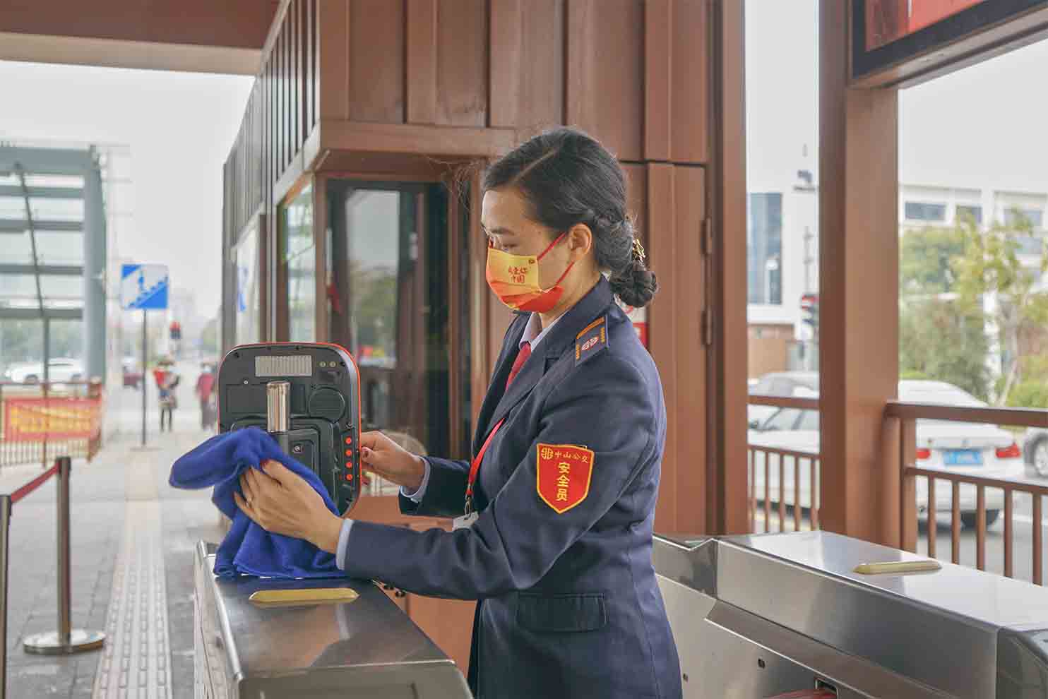 图为站务员在擦拭ic卡机