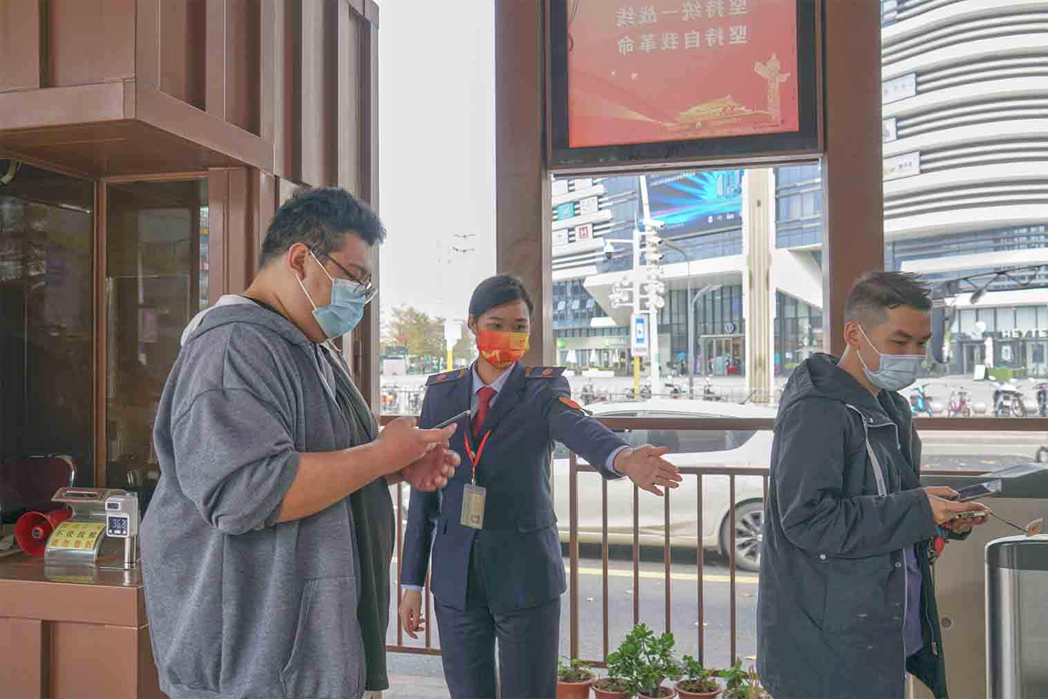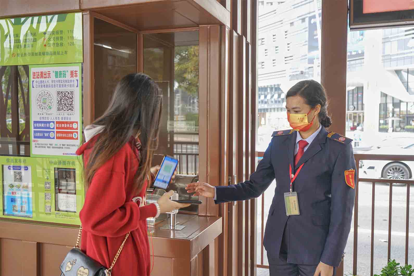 图为站务员查验乘客的健康码“绿码”