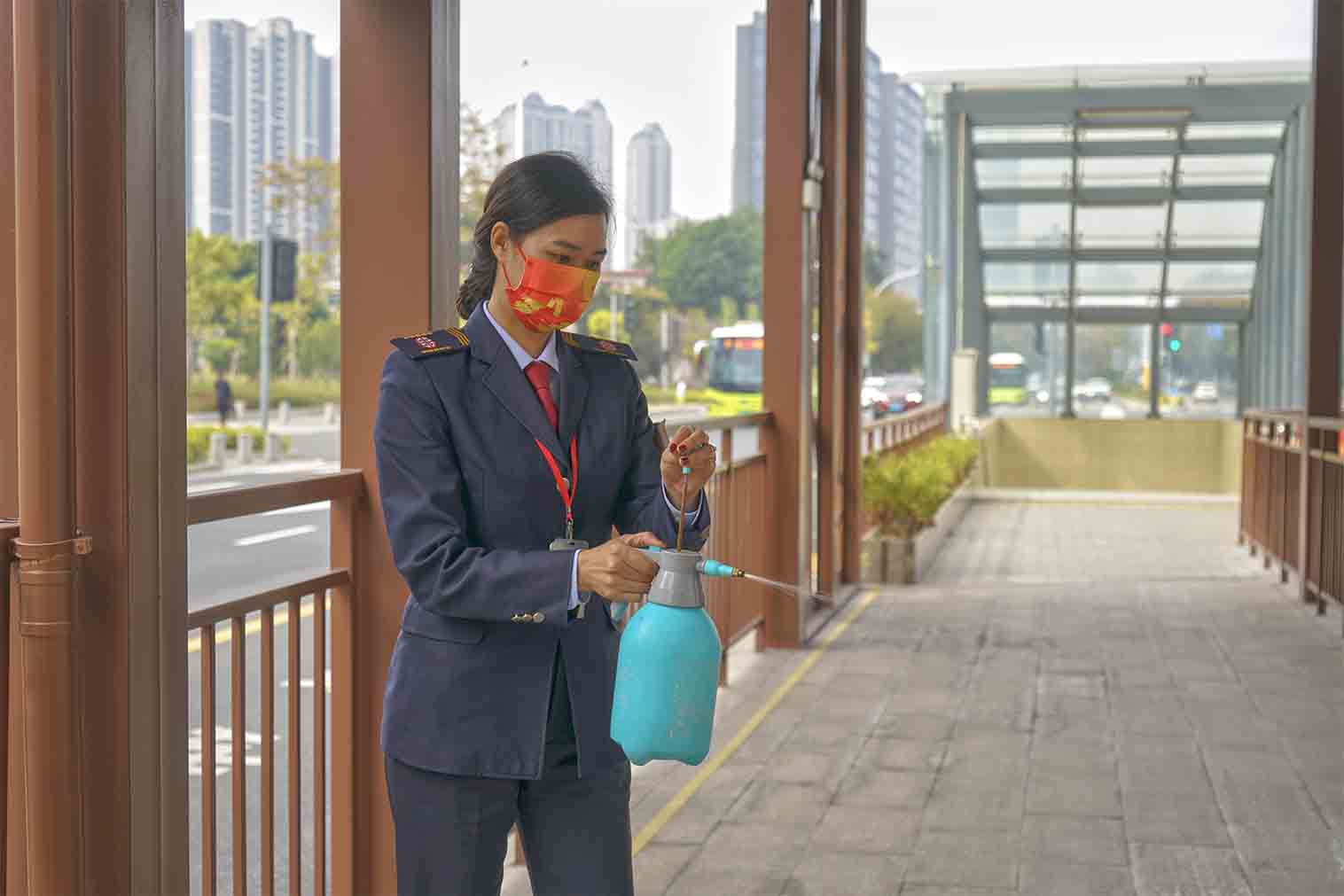 图为站务员在站内进行消毒作业