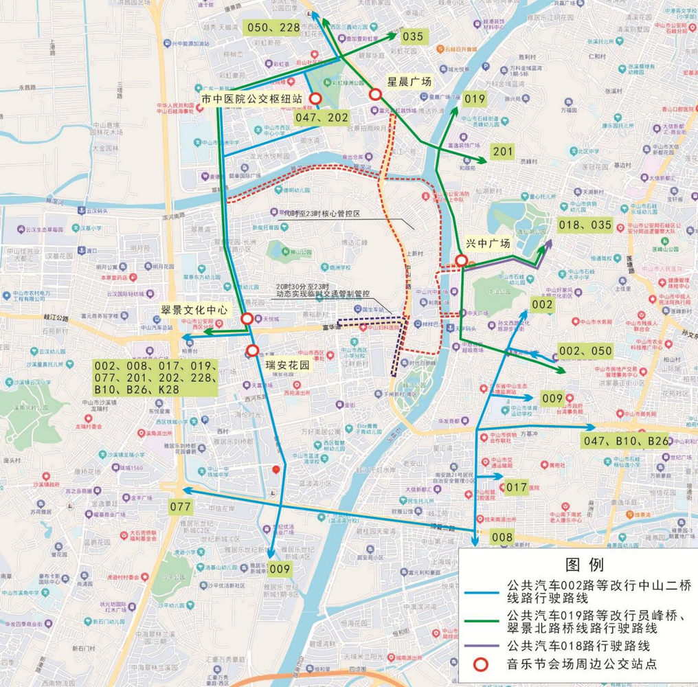 | 20:30—23:00 | 车辆自市中医院公交枢纽站发出,行驶至“市中医院”站,沿翠沙路、翠景道、博爱一路、博爱二路、悦来南路、中山二路行驶至“中山体校”站后,恢复原线行驶。 | 星晨广场、狮滘口桥、富华天桥北、中山一桥 | 翠景文化中心、瑞安花园 | ||