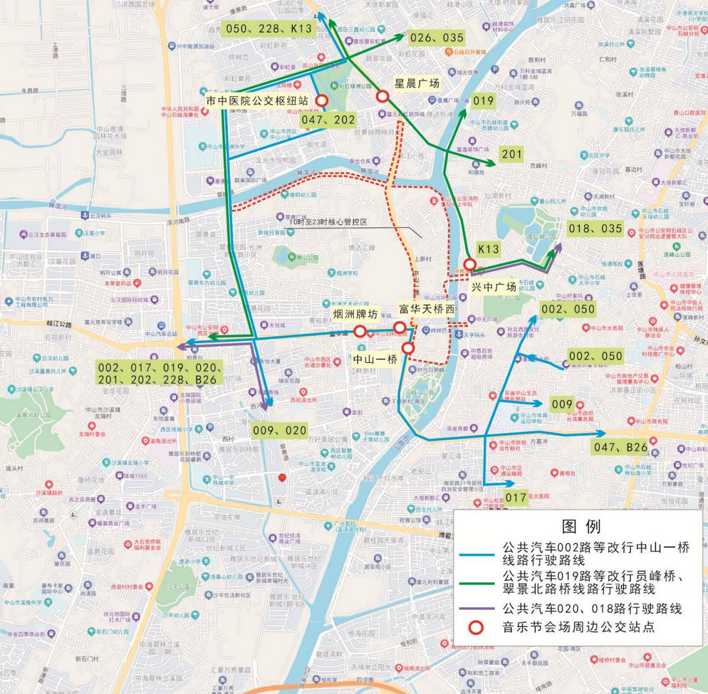 根据演出举办时间,重点加密周边公交站点(“烟洲牌坊”“中山一桥”“星晨广场”“兴中广场”公交站)的公共汽车001、002、008、009、016、017、018、019、035、047、050、077、201、209、B10、B26、K01、K13、K28路等19条公交线路日间服务班次。