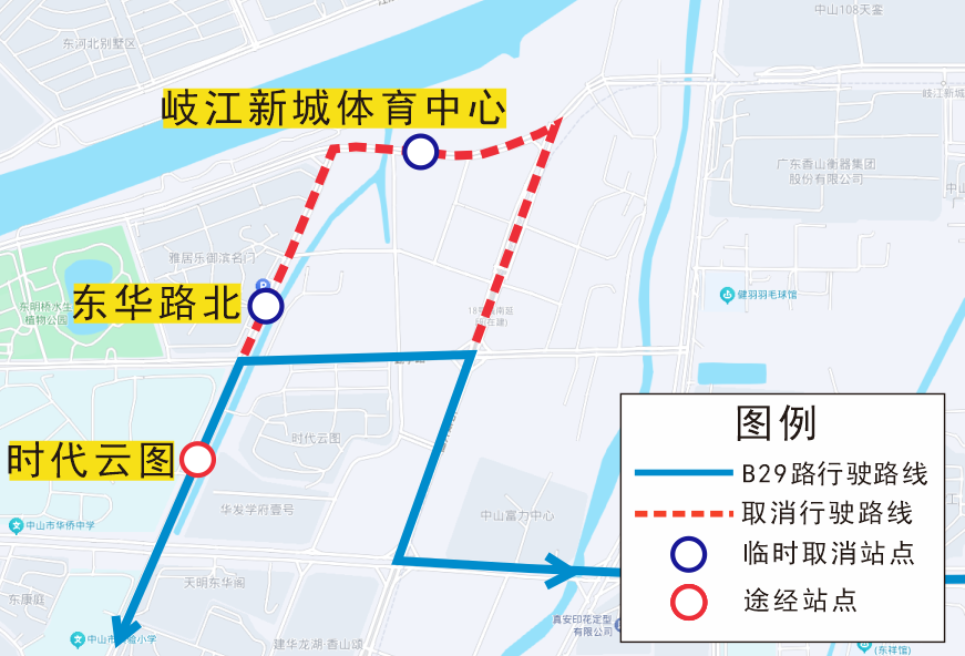 中山市2026年元旦万人迎新暨职工徒步活动将于2026年1月1日上午举行,受交通管制影响,2025年12月31日23:00至2026年1月1日9:30,公共汽车B29路双向临时取消停靠“东华路北”“岐江新城体育中心”站,具体详见附件。请市民移步至“时代云图”站乘坐公共汽车B29路。