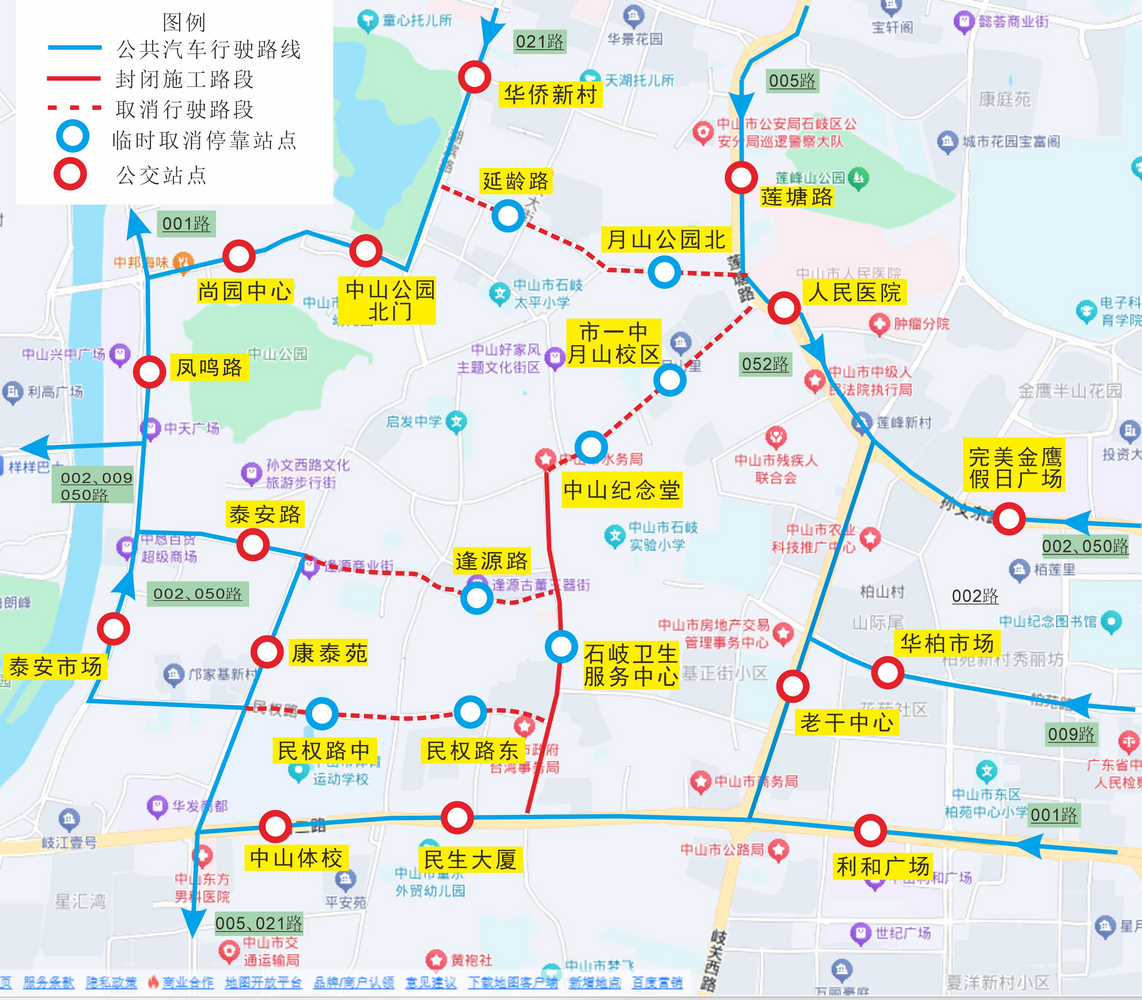| 052 | 往中山纪念堂(中山博物馆)方向 | 市一中月山校区、中山纪念堂(中山博物馆)、石岐卫生服务中心、民权路东、民权路中 | 老干中心、民生大厦、中山体校 |