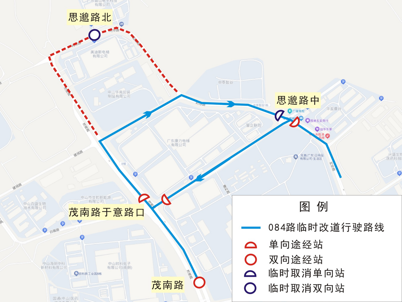 受茂南路道路围蔽施工的影响,即日起,公共汽车084路双向临时取消停靠“思邈路北”站;往茂南路方向临时取消停靠“思邈路中”站;“茂南路于意路口”(往茂南路方向)站临时迁移至于意路康力电梯公司一侧,距离路口约90米。