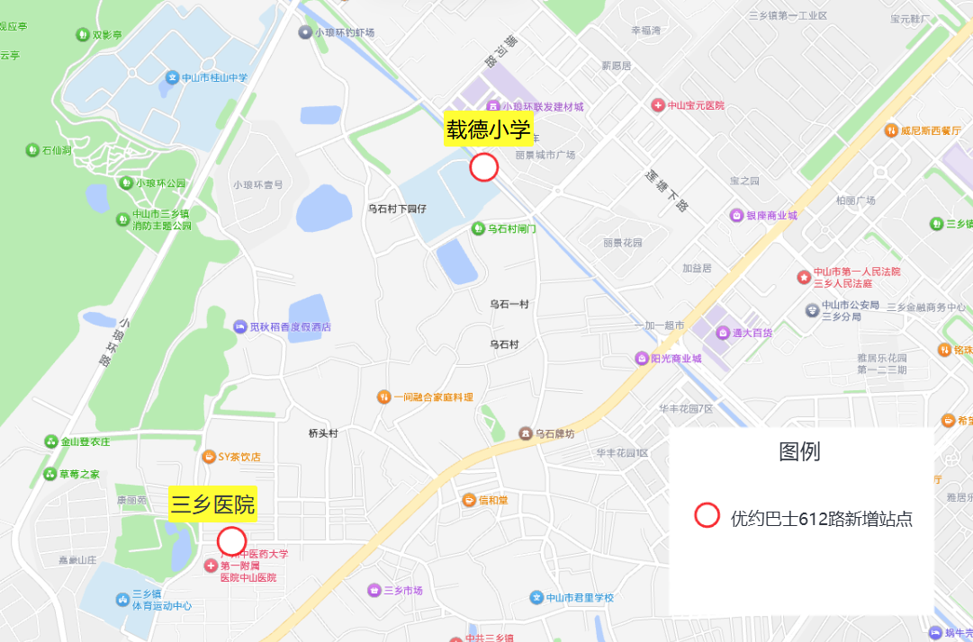 为方便市民乘车出行,自2026年3月13日起,优约巴士612路新增“三乡医院”“载德小学”站,站点分别位于三乡镇康乐路三乡医院北门附近、小琅环路载德小学东北门附近,站点具体位置详见附件。服务咨询电话:87330663,查询网址:www.zsbus.cn,或关注“中山公交集团”微信公众号。特此通告。中山市公共交通运输集团有限公司2026年3月12日附件:新增“三乡医院”“载德小学”站位置示意图新增“三乡医院”“载德小学”站位置示意图