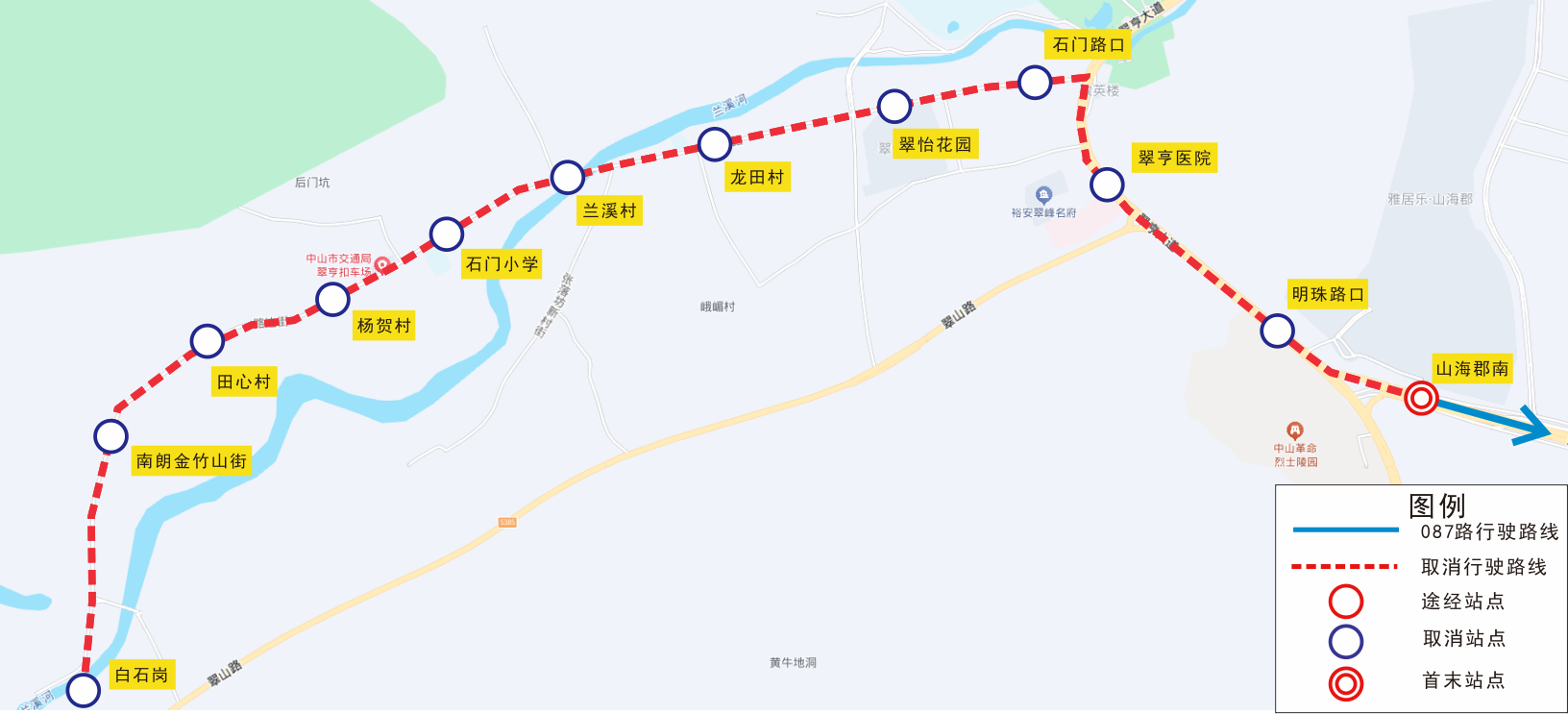 | 087 | 双向 | 白石岗、南朗金竹山街、田心村、杨贺村、石门小学、兰溪村、龙田村、翠怡花园、石门路口、明珠路口、翠亨医院 |