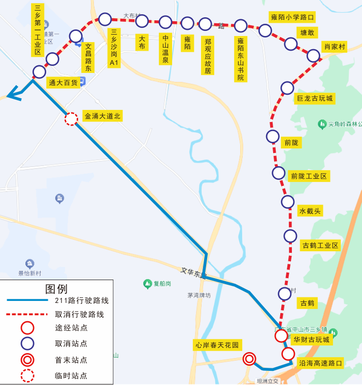 | 211 | 双向 | 通大百货、三乡第一工业区、文昌路东、三乡沙岗A1、大布、中山温泉、雍陌、郑观应故居、雍陌东山书院、雍陌小学路口、塘敢、肖家村、巨龙古玩城、前陇、前陇工业区、水截头、古鹤工业区、古鹤 |