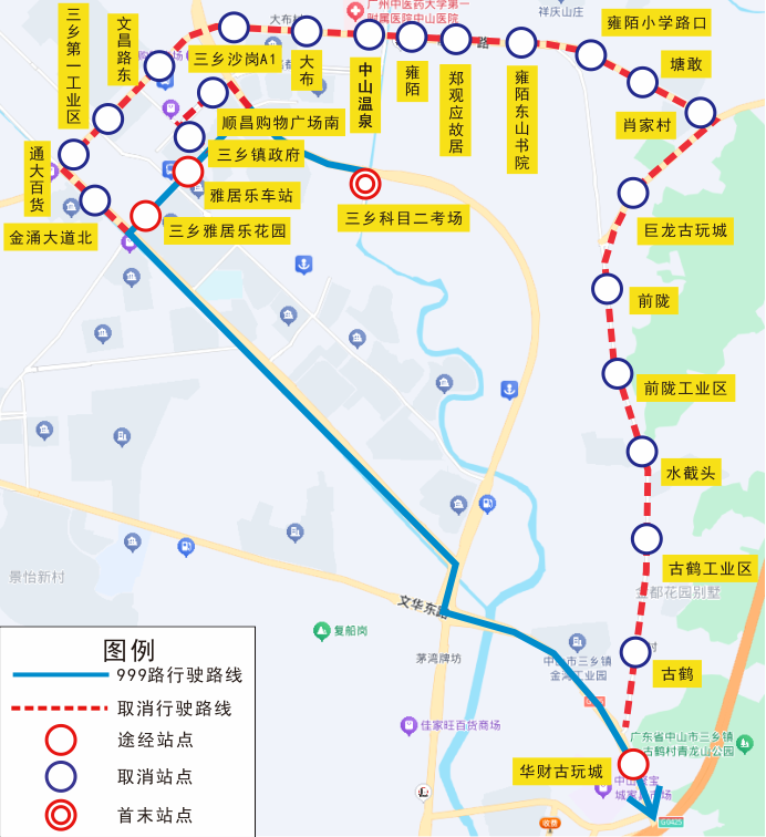 | 999 | 双向 | 三乡镇政府、顺昌购物广场南、金涌大道北、通大百货、三乡第一工业区、文昌路东、三乡沙岗A1、大布、中山温泉、雍陌、郑观应故居、雍陌东山书院、雍陌小学路口、塘敢、肖家村、巨龙古玩城、前陇、前陇工业区、水截头、古鹤工业区、古鹤 |