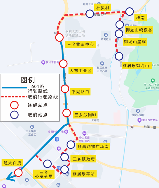 | 601 | 双向 | 雅居乐御龙山、御龙山星耀、御龙山鸣泉谷、桂南、社贝村、顺昌购物广场南、三乡镇政府、雅居乐车站、三乡公安分局 |