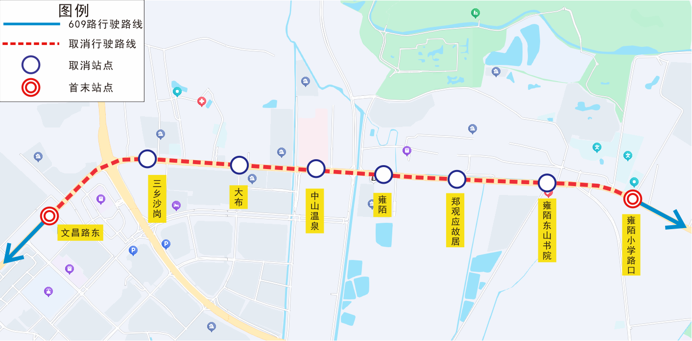 | 609 | 双向 | 线路临时拆分为“泉林山庄-文昌路东”和“雍陌小学路口-竹林埔”两段运营临时取消:三乡沙岗A1、大布、中山温泉、雍陌、郑观应故居、雍陌东山书院等站 |