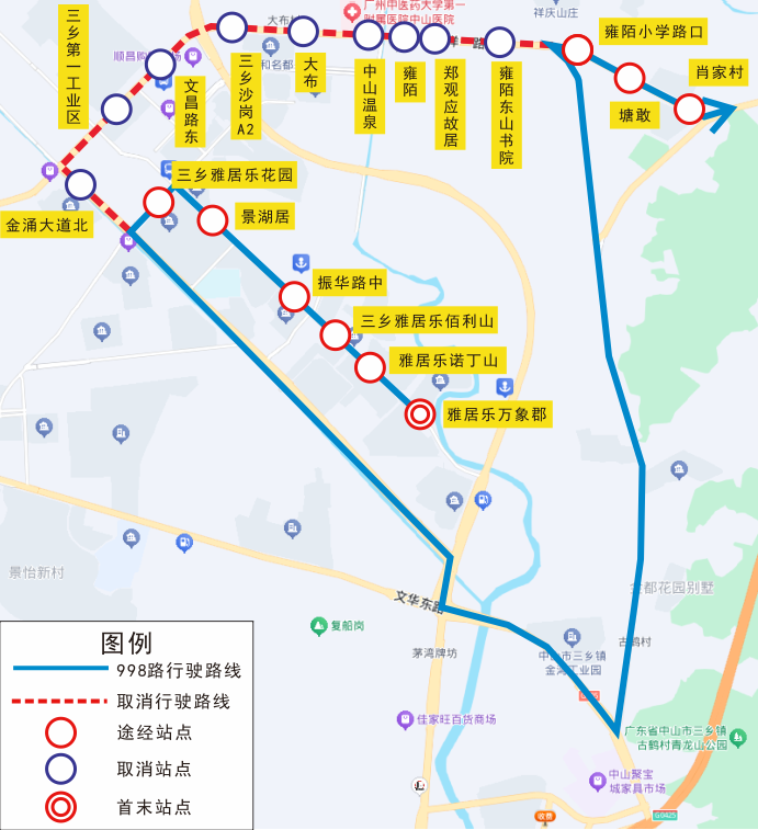 | 998 | 双向 | 雅居乐万象郡、雅居乐诺丁山、三乡雅居乐佰利山、振华路中、景湖居、三乡雅居乐花园、金涌大道北、通大百货、三乡第一工业区、文昌路东、三乡沙岗A2、大布、中山温泉、雍陌、郑观应故居、雍陌东山书院 |