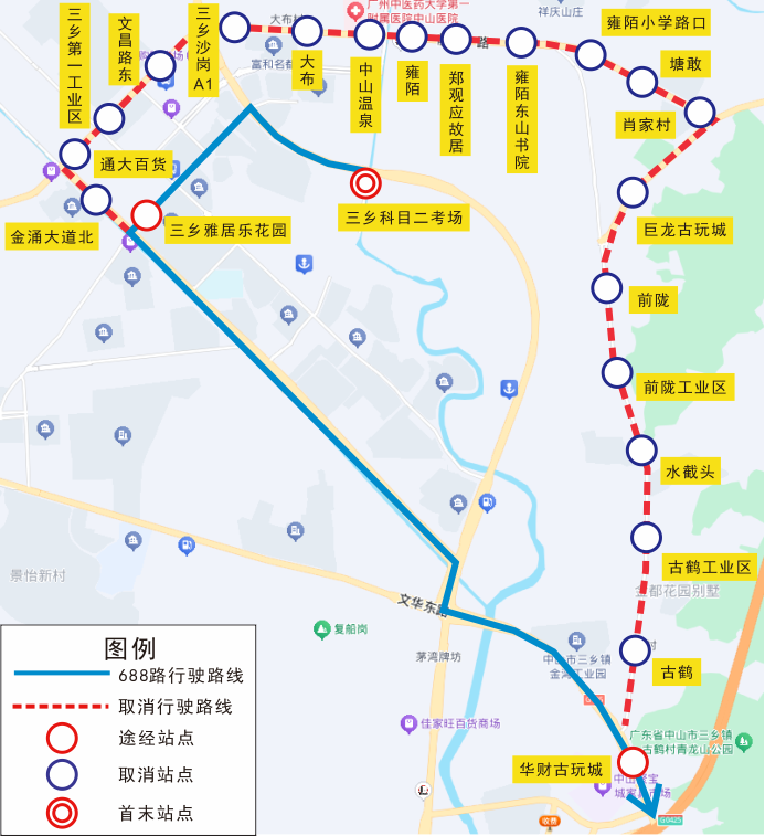 | 688 | 双向 | 金涌大道北、通大百货、三乡第一工业区、文昌路东、三乡沙岗A1、大布、中山温泉、雍陌、郑观应故居、雍陌东山书院、雍陌小学路口、塘敢、肖家村、巨龙古玩城、前陇、前陇工业区、水截头、古鹤工业区、古鹤 |
