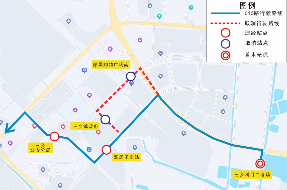 | 615 | 双向 | 三乡镇政府、顺昌购物广场南 |
