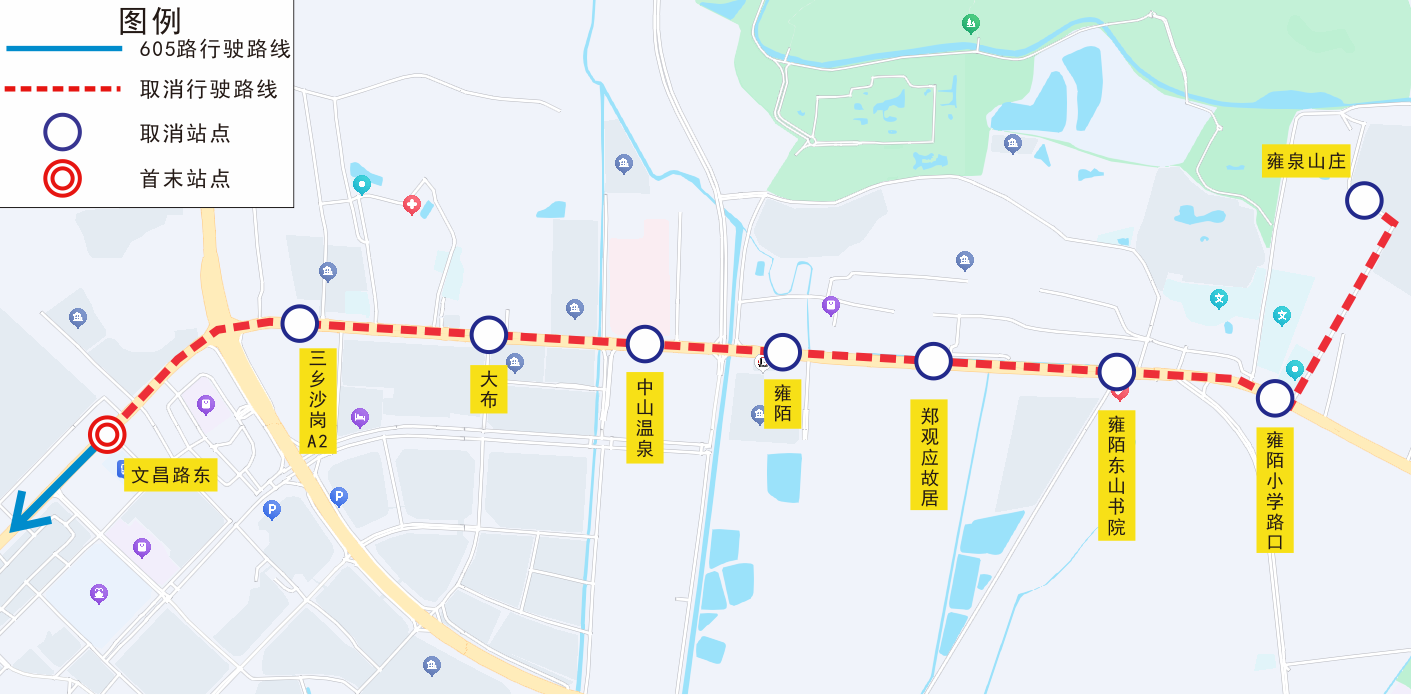 | 605 | 双向 | 三乡沙岗A1、大布、中山温泉、雍陌、郑观应故居、雍陌东山书院、雍陌小学路口、雍泉山庄 |