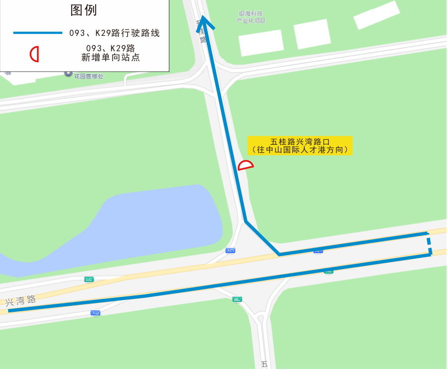 为方便市民乘车出行,自2026年4月2日起,公共汽车093、K29路新增“五桂路兴湾路口”站(往中山国际人才港方向),站点位于马鞍岛五桂路兴湾路口向北约100米处,具体位置详见附件。服务咨询电话:87330663,查询网址:www.zsbus.cn,或关注“中山公交集团”微信公众号。特此通告。中山市公共交通运输集团有限公司2026年3月31日附件:新增“五桂路兴湾路口”站位置示意图新增“五桂路兴湾路口”站位置示意图