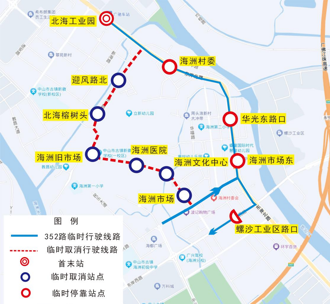 | 352 | 往古镇灯饰学院方向 | 从北海工业园开出,改行东岸北路、海兴路后,再按原线行驶。 | 海洲村委、华光东路口、海洲市场东、螺沙工业区路口 | 迎风路北、北海榕树头、海洲旧市场、海洲医院、海洲文化中心、海洲市场 |