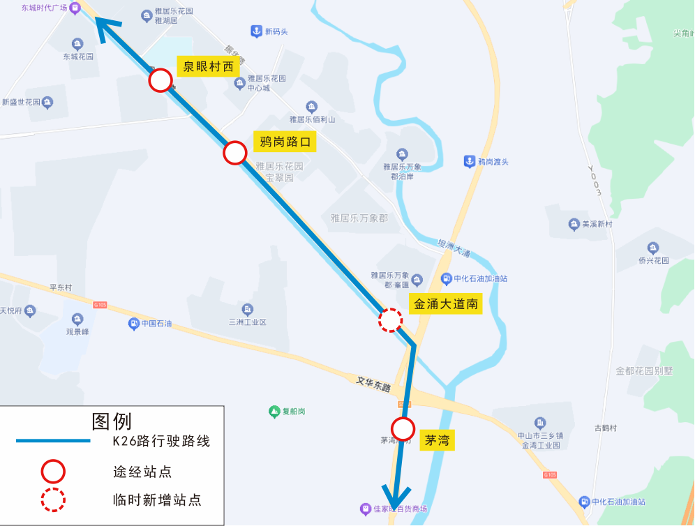 为方便市民乘车出行,自2026年4月11日起,公共汽车K26路临时新增停靠“金涌大道南”站,票价参考“茅湾”站,站点具体位置详见附件。服务咨询电话:87330663,查询网址:www.zsbus.cn,或关注“中山公交集团”微信公众号。特此通告。中山市公共交通运输集团有限公司2026年4月9日附件:公共汽车K26路临时新增停靠“金涌大道南”站位置示意图公共汽车K26路临时新增停靠“金涌大道南”站位置示意图
