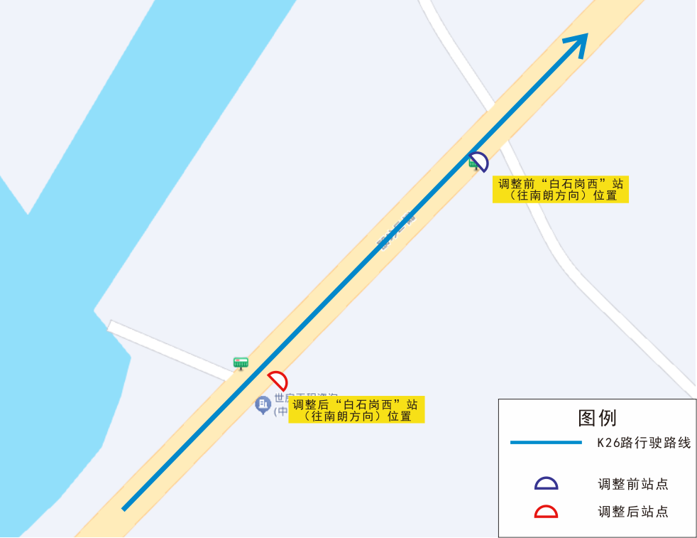 为进一步优化站点设置,消除车辆停靠安全隐患,即日起,公共汽车K26路途经的“白石岗西”站(往南朗方向)位置向西南迁移约50米,具体位置详见附件。服务咨询电话:87330663,查询网址:www.zsbus.cn,或关注“中山公交集团”微信公众号。特此通告。中山市公共交通运输集团有限公司 2026年4月13日附件:翠山公路“白石岗西”站(往南朗方向)位置调整示意图翠山公路“白石岗西”站(往南朗方向)位置调整示意图