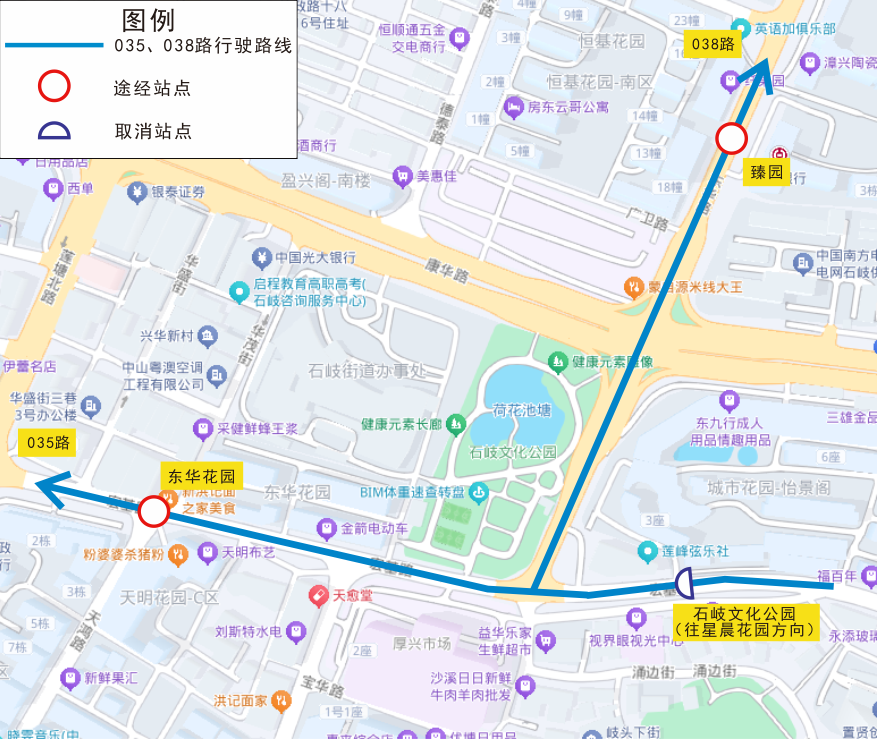 公共汽车035、038路临时取消停靠“石岐文化公园”站(往星晨花园方向)示意图