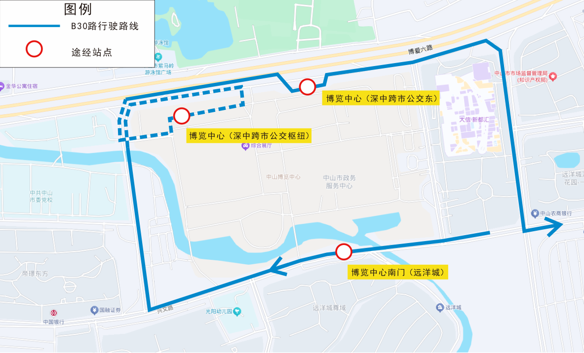 为方便市民乘坐深中跨市公交,2026年4月28日起,公共汽车B30路临时新增停靠“博览中心(深中跨市公交枢纽)”站。服务咨询电话:87330663,查询网址:www.zsbus.cn,或关注“中山公交集团”微信公众号。特此通告。中山市公共交通运输集团有限公司2026年4月24日附件:公共汽车B30路临时新增停靠“博览中心(深中跨市公交枢纽)”站示意图公共汽车B30路临时新增停靠“博览中心(深中跨市公交枢纽)”站示意图