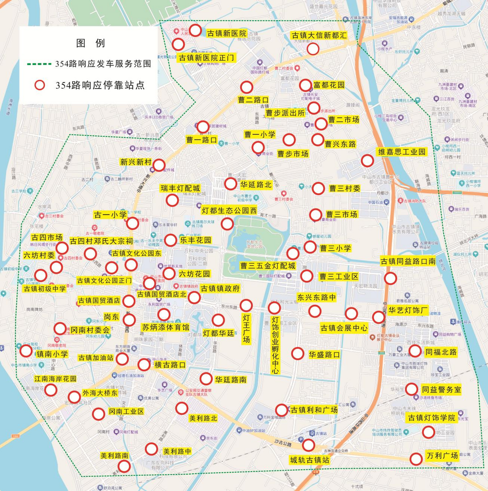 曹步派出所、曹步市场、曹二路口、曹三村委、曹三工业区、曹三市场、曹三五金灯配城、曹三小学、曹兴东路、曹一路口、曹一小学、城轨古镇站、灯都华廷、灯都生态公园西、灯饰创业孵化中心、灯王广场、富都花园、岗南村委会、岗南工业区、古镇大信新都汇、古镇国贸酒店北、古镇会展中心、古镇利和广场、古镇文化公园东、古镇新医院、古镇镇政府、横古路口、华盛路口、华廷路北、华廷路南、江南海岸花园、乐丰花园、六坊花园、美利路北、美利路南、美利路中、瑞丰灯配城、苏炳添体育馆、外海大桥东、镇南小学、曹二市场、东兴东路中、岗东、古四市场、古四村邓氏大宗祠、古一小学、新兴新村、古镇初级中学、古镇灯饰学院、古镇加油站、古镇同益路口南、古镇文化公园正门、华艺灯饰厂、六坊村委、同福北路、同益警务室、万利广场、维嘉思工业园、古镇新医院正门、古镇国贸酒店。