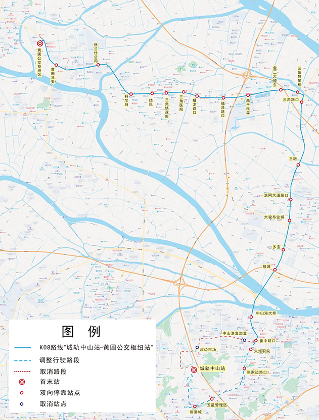 为进一步扩大公交服务覆盖范围,方便群众公交出行。我公司拟优化调整公共汽车k08路线“城轨中山站-黄圃公交枢纽站”部分行驶路段,具体情况如下: